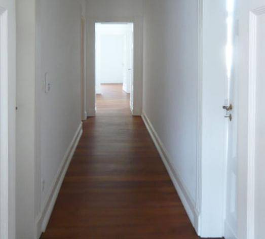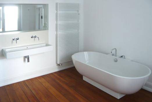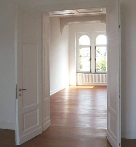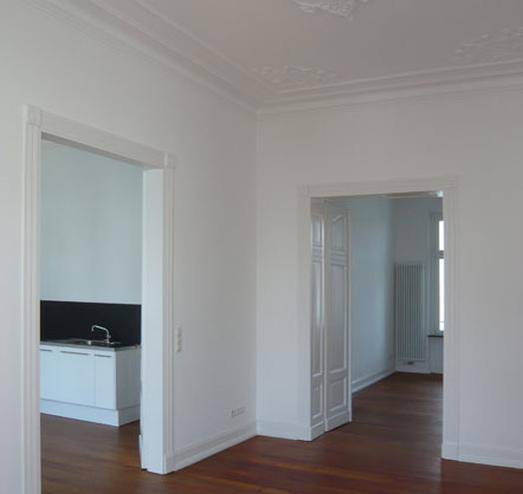 alle geschosse wurden mit neuen installationen versehen, die einrichtung der bäder ist hochwertig und wird der erhabenen wirkung der stuckverzierten räume gerecht. die teilweise 7meter langen pitchpinediehlen wurden geschliffen, restauriert, geölt und bilden mit ihrem warmen farbton einen harmonischen kontrast zu den weißen wänden und decken.