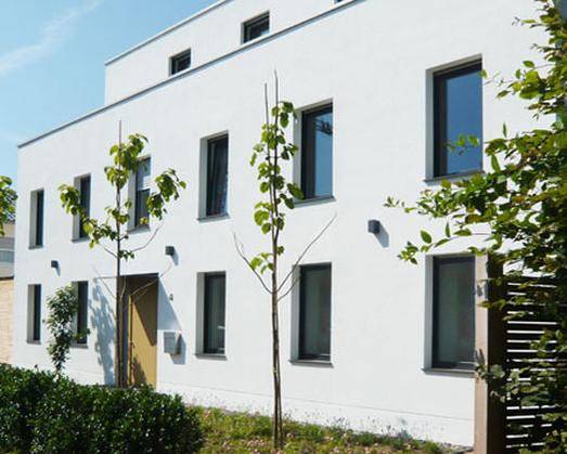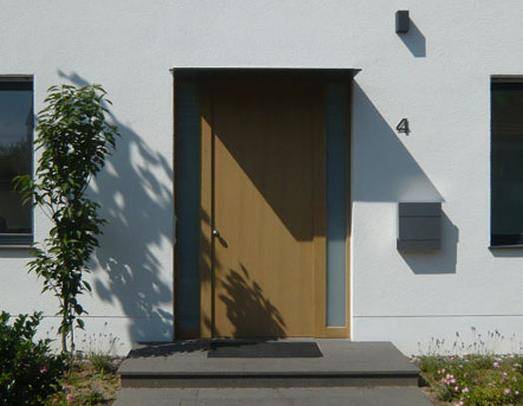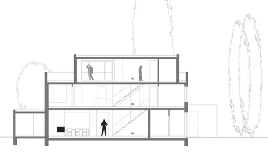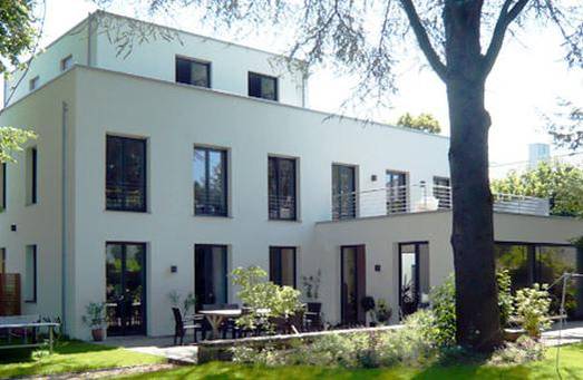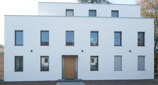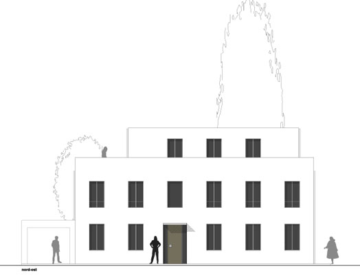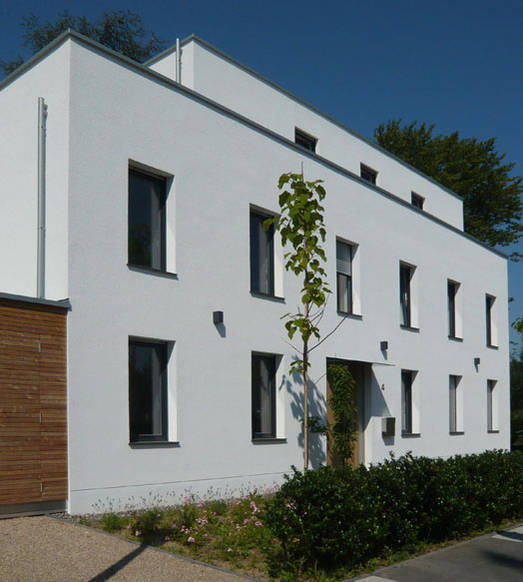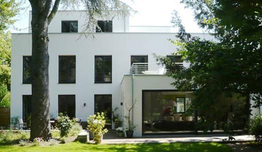 die fassadenteilung an straßen- und gartenseite folgt einem klaren raster und entwickelt sich aus dem gebäudeinneren.