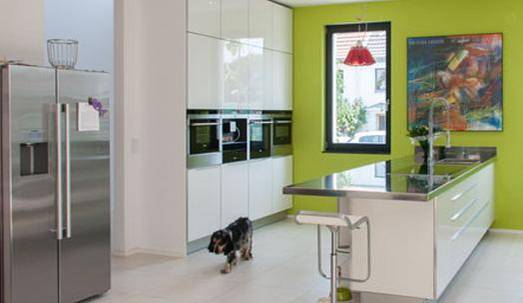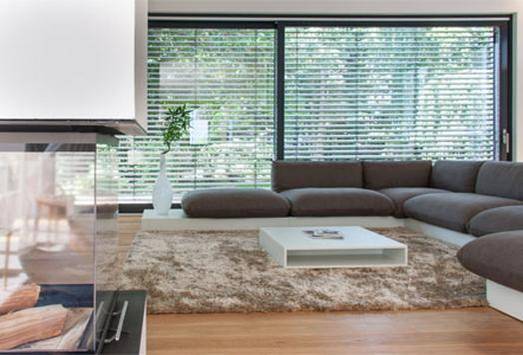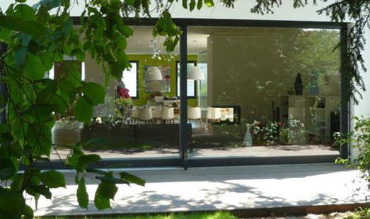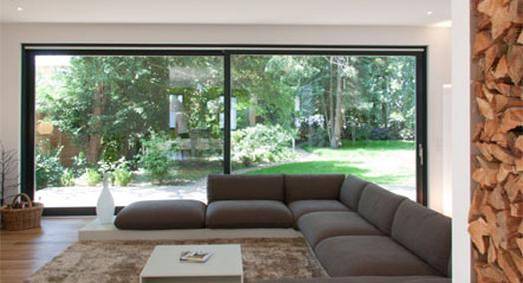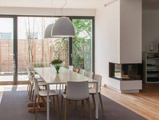 der wohnraum schiebt sich in der raumfolge aus küche und essraum in richtung garten und öffnet sich dort mit einem großen panoramaschiebefenster.