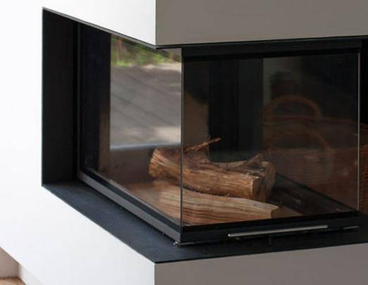 ein gemauerter kaminofen bildet eine räumliche trennung zwischen ess- und wohnbereich.