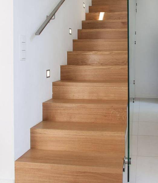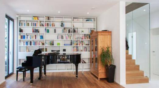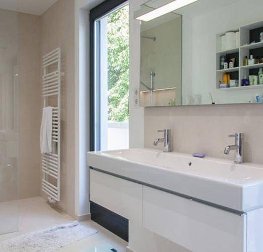 die materialität im haus wird geprägt durch glatt verputzte weiße wände, einem holzdiehlenboden aus eiche und einer cremefabenen fliese.