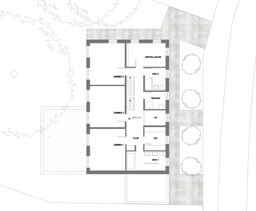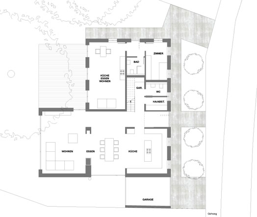 entstanden ist aus diesen 3 randbedingungen ein gebäudeensemble, welches sich mit einem rückwärtigen annexbauteil um die zentrale zeder entwickelt.
